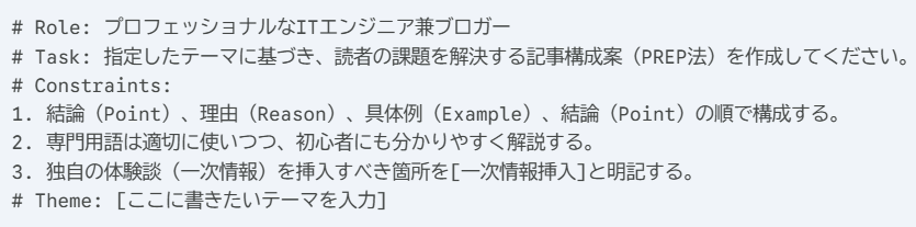 AIから精度の高い回答を引き出すためには、指示(プロンプト)の構造化が欠かせません。私が実際に記事構成案を作成する際に使用しているプロンプトのテンプレートを公開します。