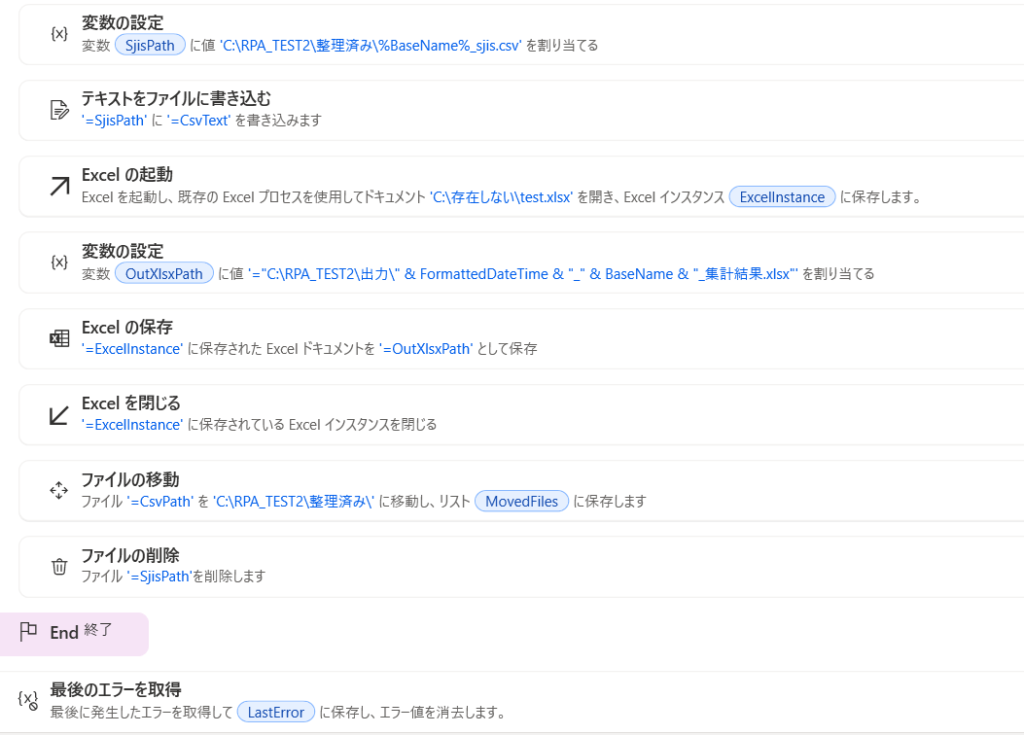ファイル名取得・日時付与・SJIS変換・Excel加工処理までを実装。