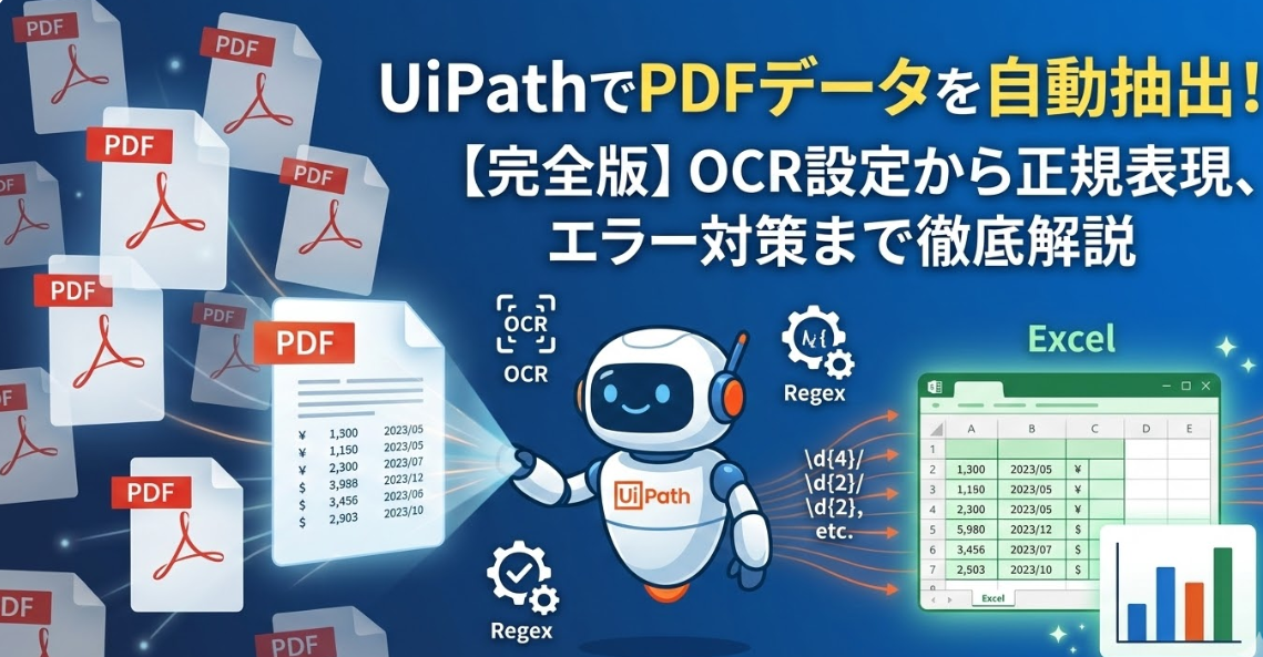 UiPathでPDFからデータを自動抽出する方法を徹底解説!『PDFテキストを読み込み』の設定手順から、OCRを使った画像PDFの読み取り、実務で役立つエラー対策まで、現役エンジニアの視点で分かりやすく紹介します。手入力の作業をゼロにしたい方は必見のガイドです。