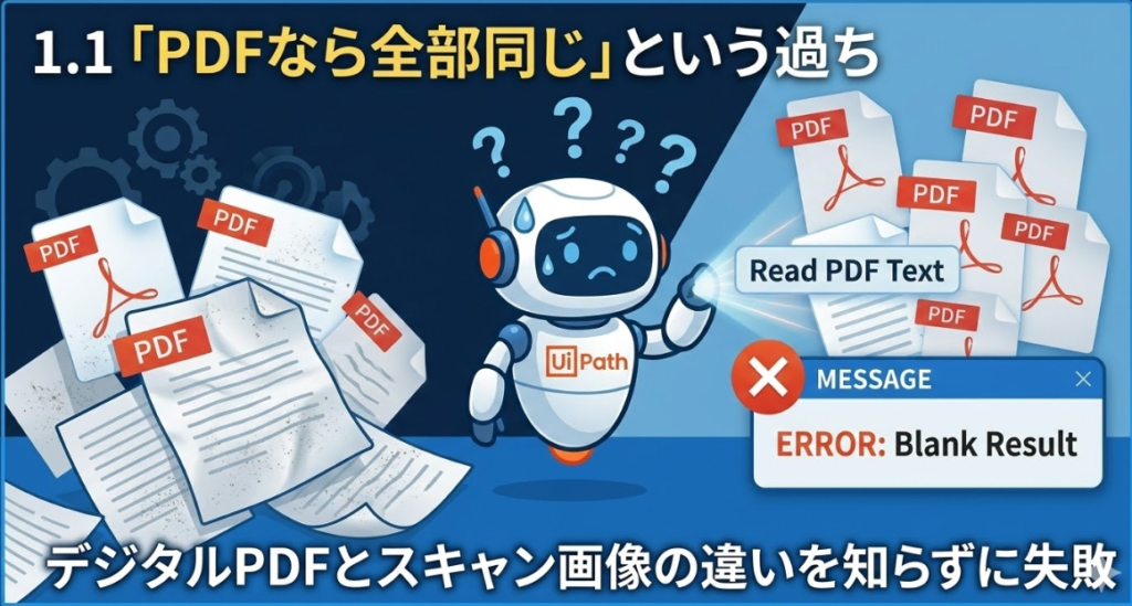 UiPathでPDFの自動化を始めたばかりの頃、私は大きな勘違いをしていました。それは、「PDFならどのアクティビティを使っても同じ結果が出るはずだ」という思い込みです。しかし、実務の現場はそんなに甘くありませんでした。