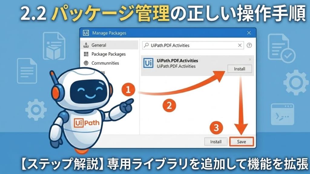 UiPath.PDF.Activitiesと入力します。 - インストールと保存:該当するパッケージが表示されたら「インストール」をクリックし、最後に「保存」を押して完了です。