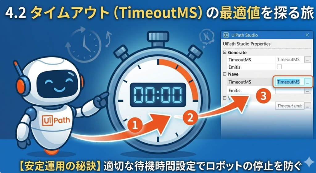 多くのアクティビティには「TimeoutMS」というプロパティがあります。デフォルトは30,000ミリ秒(30秒)ですが、これが常に正解とは限りません。