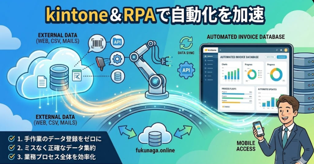 既存の基幹システムからデータを抽出し、kintoneへアップロードといったルーチンワークはRPAの得意分野です。API連携が難しい古いシステムと、柔軟なkintoneを繋ぐ「架け橋」としてRPAを活用することで、完全自動化されたエコシステムが完成します。
