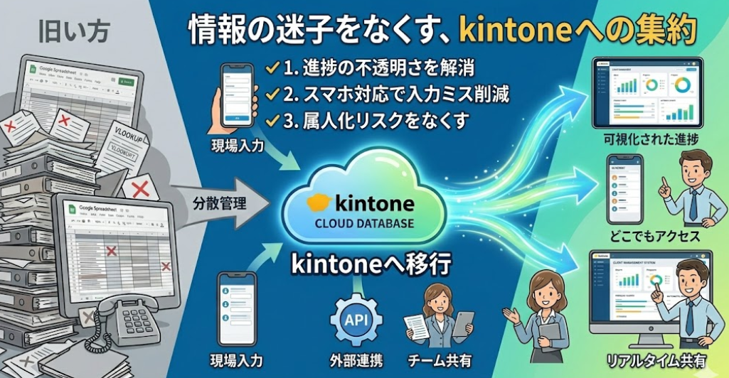 かつては万能に思えたシートも、情報が複雑に絡み合う現代の業務フローにおいては、時に効率を阻害する「足かせ」になりかねません。注目されているのが、ノーコードツール「kintone(キントーン)」の移行です。