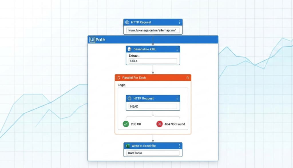 多くの初心者は、ブラウザで一つひとつページを開く自動化を想像しますが、効率的ではありません。UiPathのHTTP Requestアクティビティを使用することで、画面を表示させずに通信レベルでリンクの生存確認が行えます。