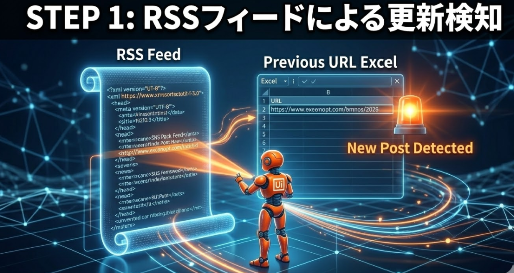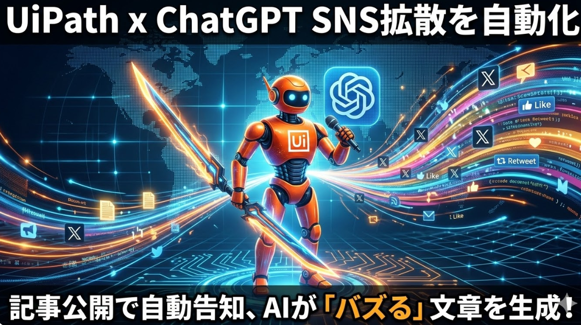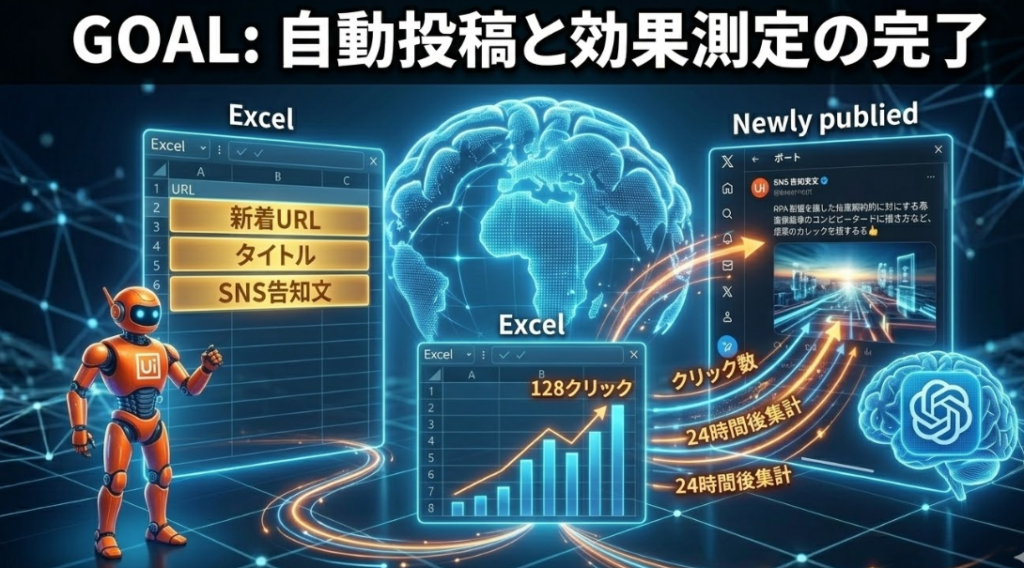 まず、UiPathがブログのRSSを確認し、新着記事の有無を判断します。次に、新着があればChatGPTがその内容を読み取り、Xのトレンドに合わせたキャッチコピーを生成します。最後に、UiPathが投稿を代行し、24時間後にはその効果(クリック数)をExcelへ集計するという流れです。